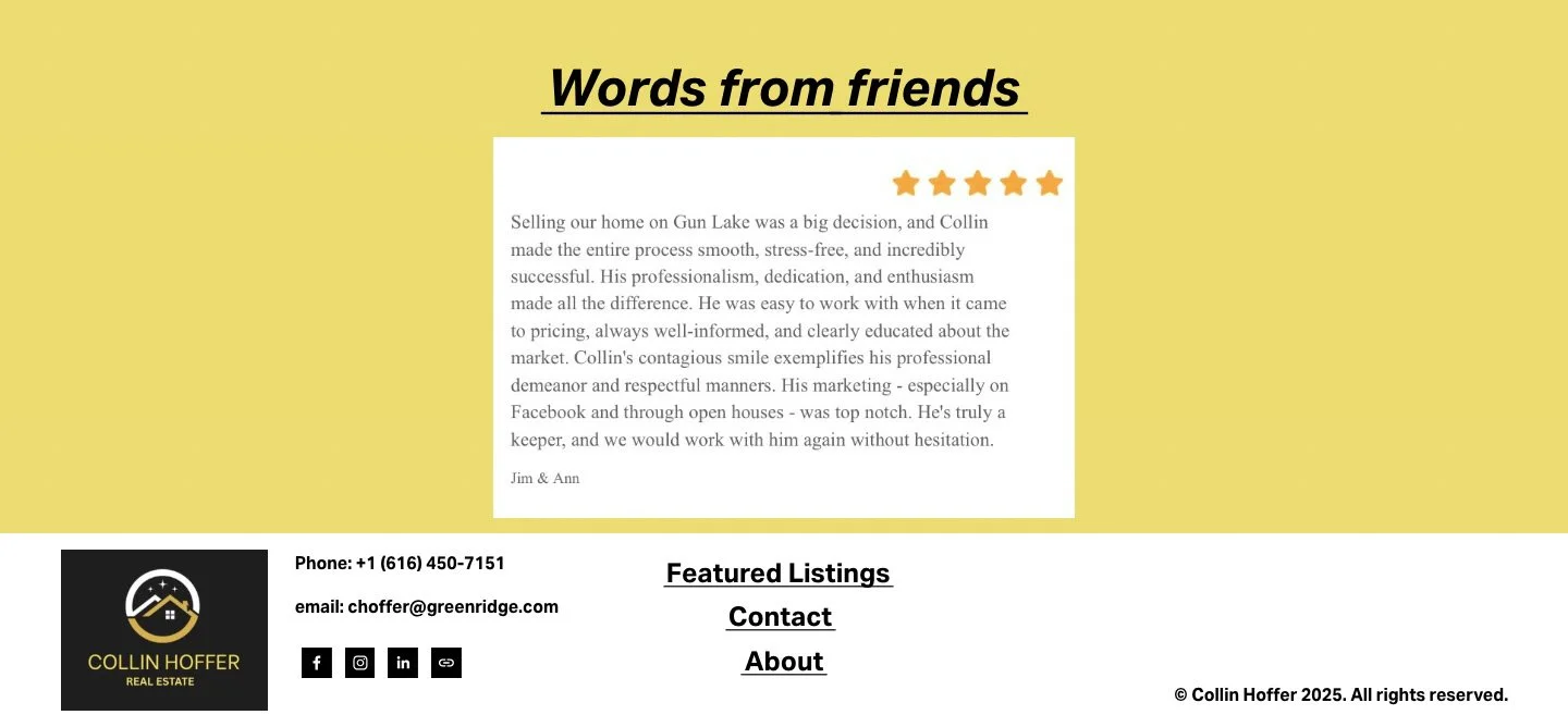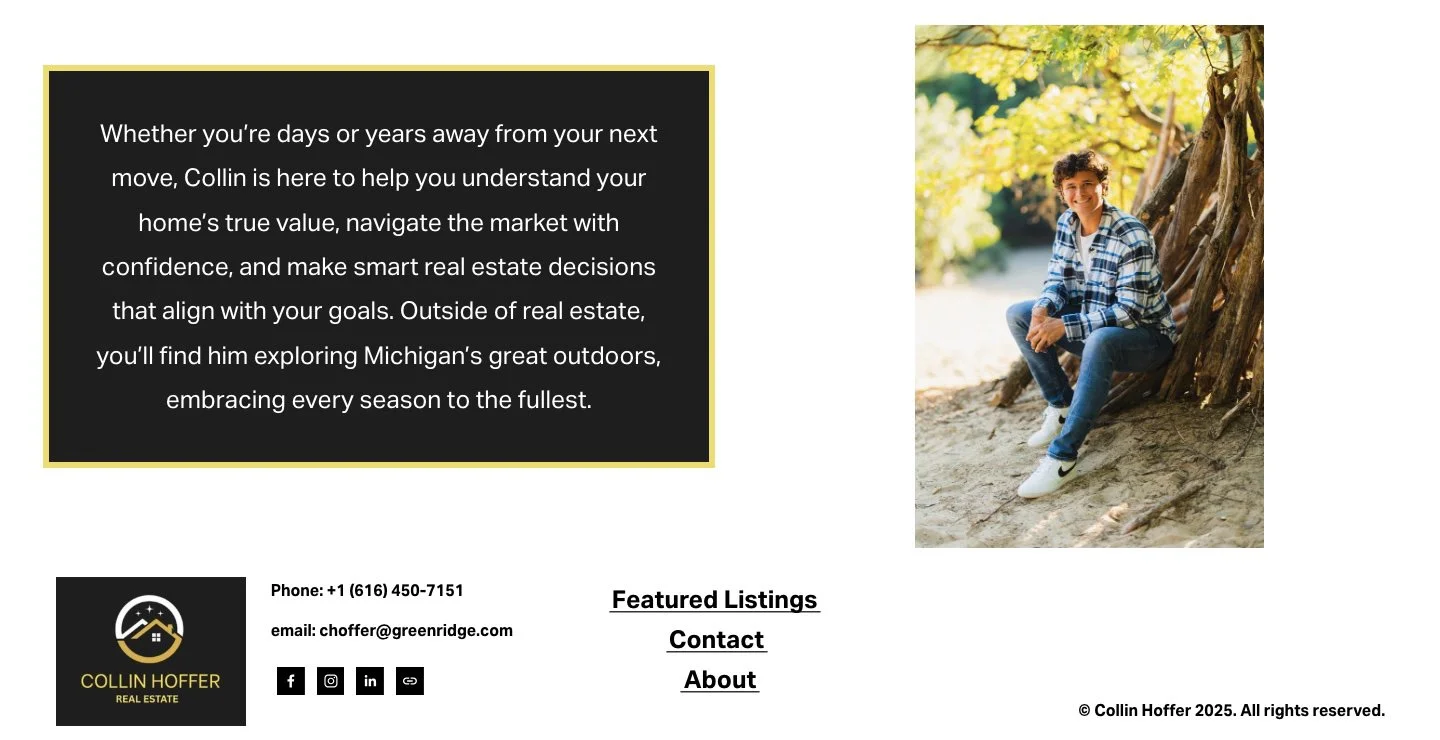 Collin Hoffer is a trusted West Michigan real estate advisor. Born and raised in Forest Hills and a graduate of Grand Rapids Catholic Central, Collin combines deep local roots with a strong academic background in Finance and Economics from Xavier and Calvin University. Collin believes real estate is about more than buying or selling—it’s about building long-term wealth and creating lasting relationships.